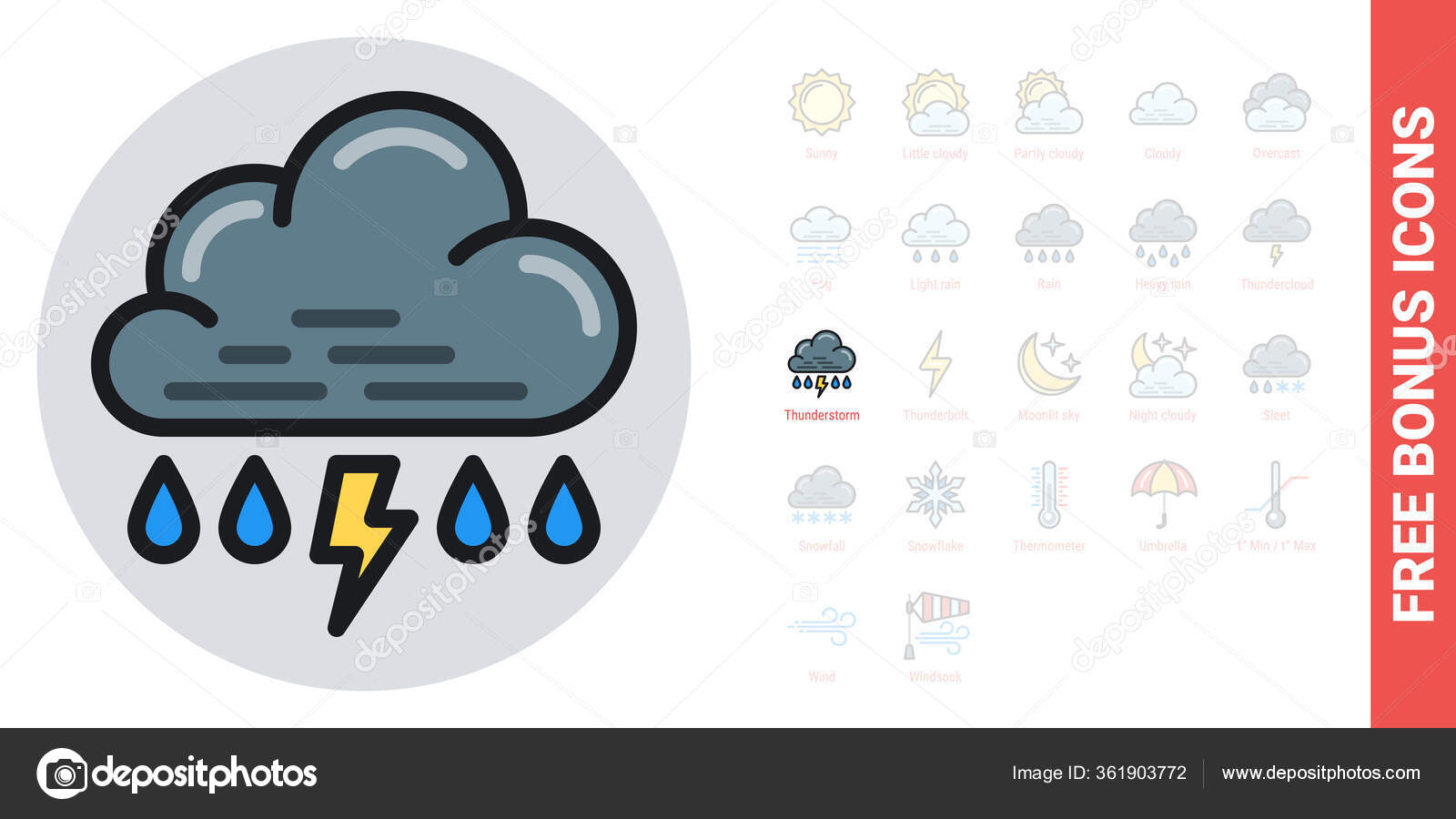 雨与雷电或雷暴图标的天气预报应用或小部件 云有雨滴和闪电 简单的颜色版本 免费的奖金图标套件包括 图库矢量图像 C Realvector